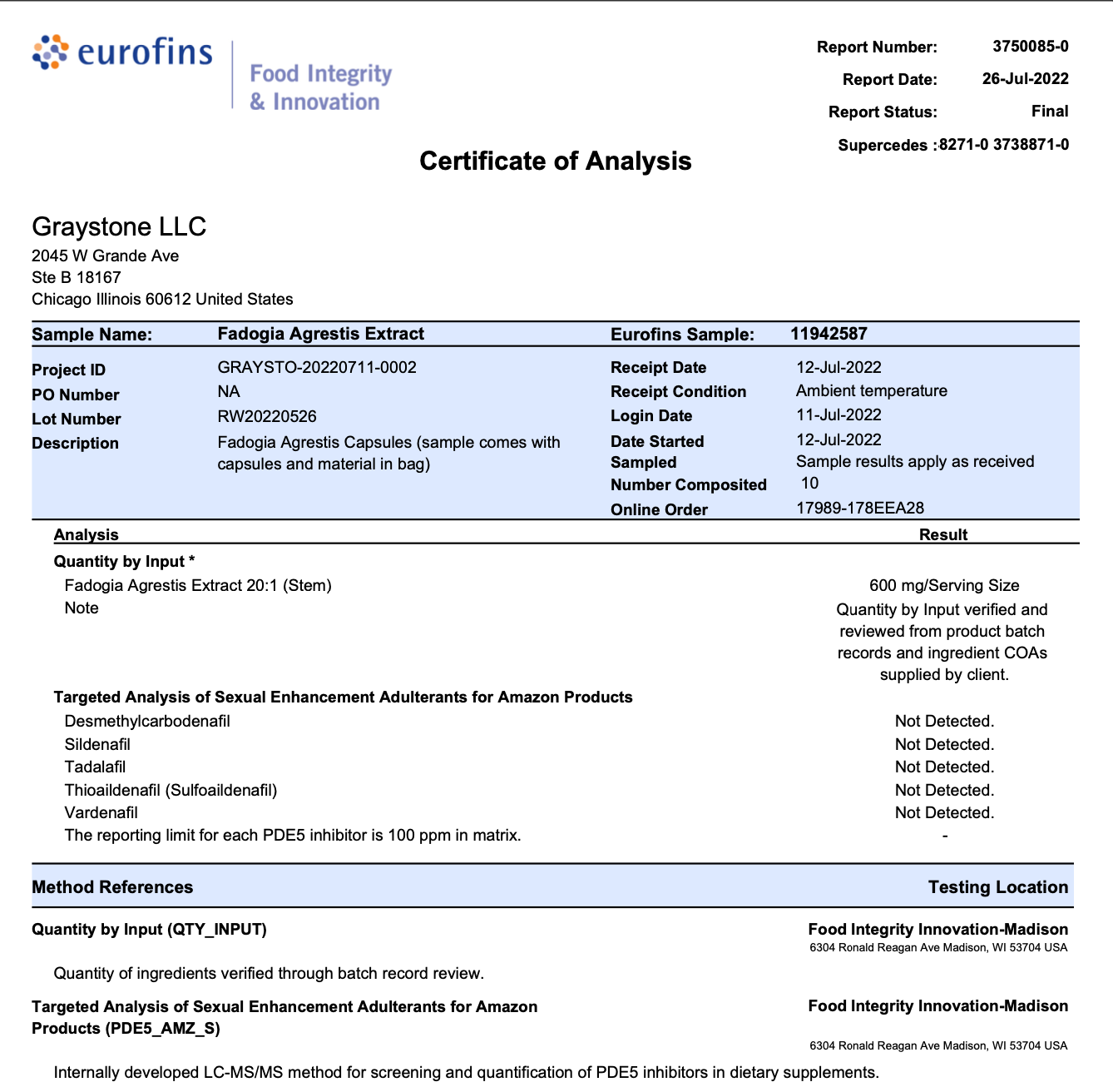 All our batches are inspected by By Eurofins (https://www.eurofins.com/) for ID testing as well as potency testing and quantity by input.