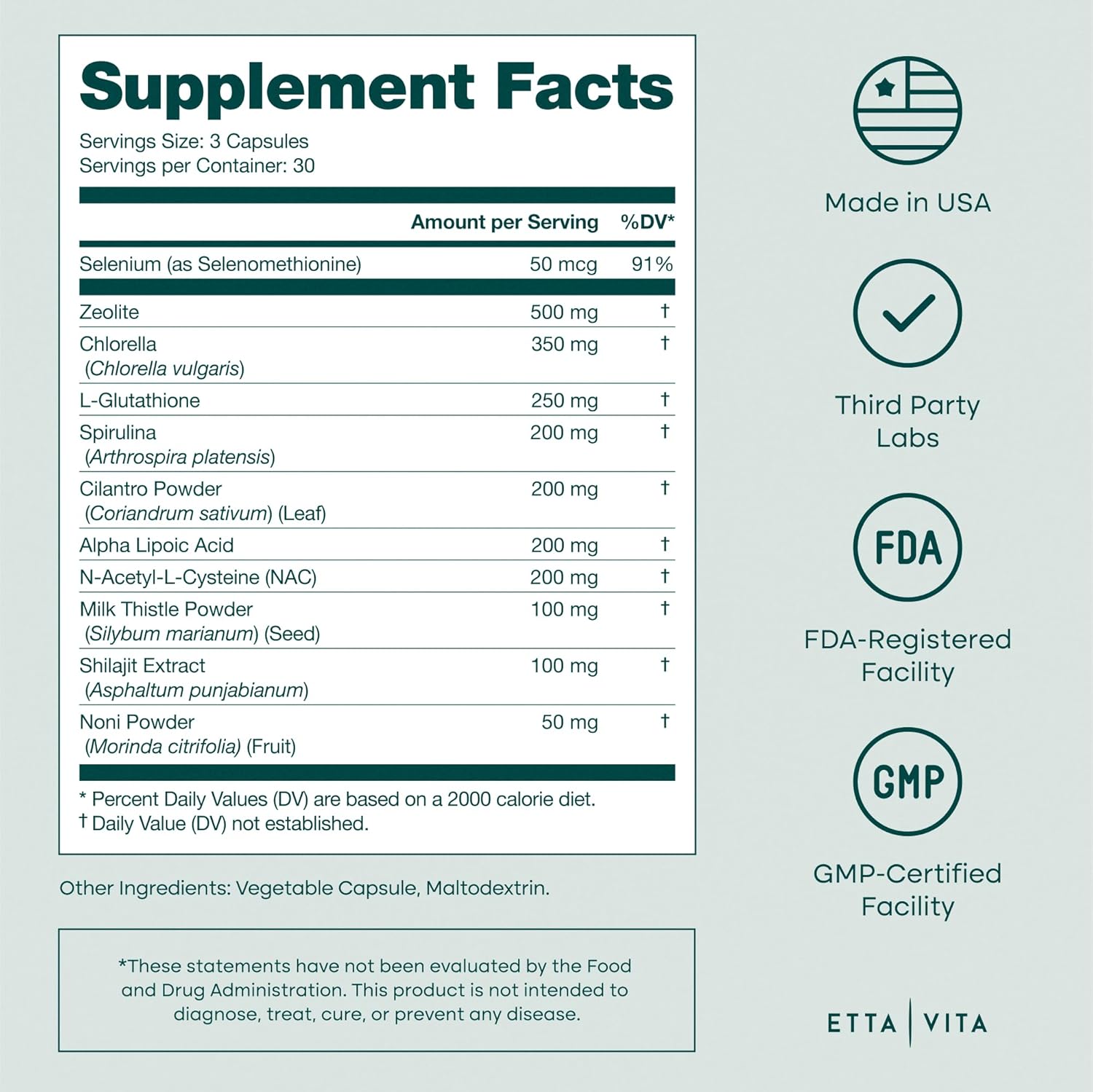Zeolite and Cilantro are known for their binding abilities, helping your body eliminate harmful heavy metals. Chlorella adds extra support for toxin capture and cellular rejuvenation.