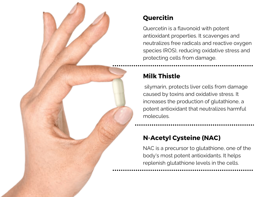 Our formula has Quercetin, Milk Thistle, Molybdenum, and Selenium to restore intracellular levels of Glutathione, deliver antioxidant mitochondria support, reduce liver damage from contaminants, and detox & cleanse the body.