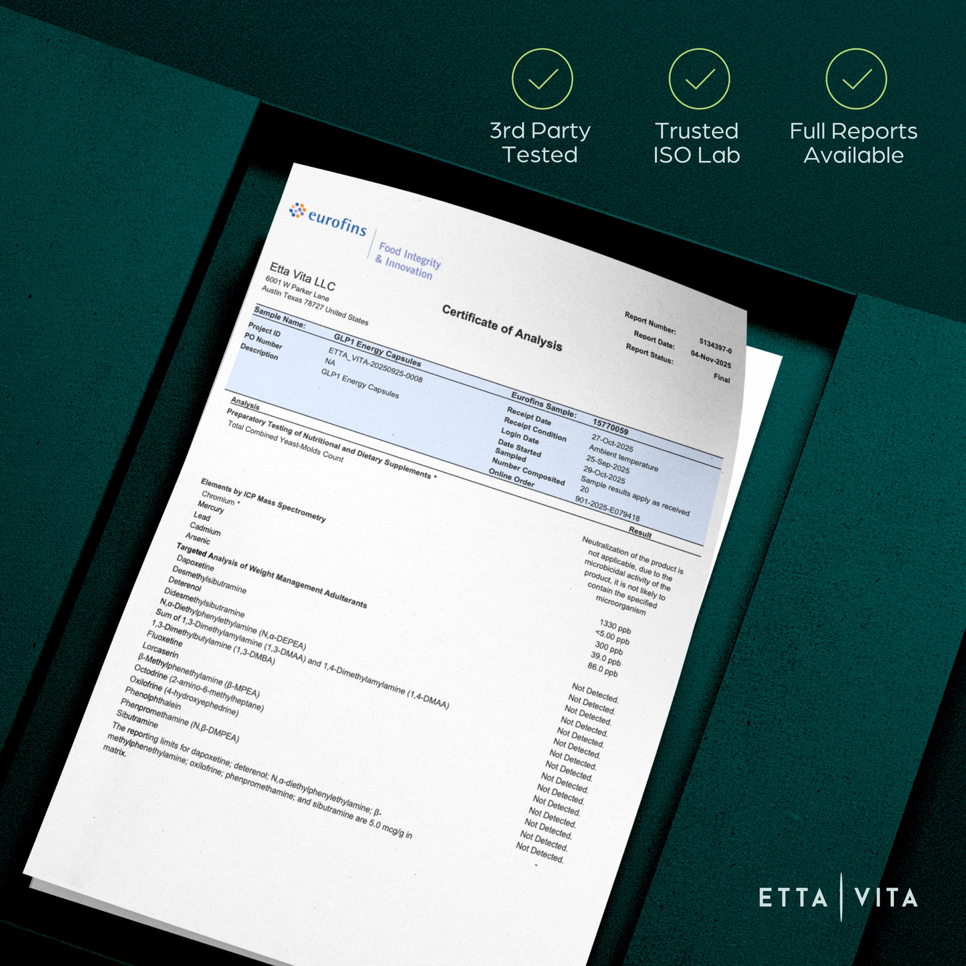 At Etta Vita, we recognize that a vast majority of brands prioritize profits over integrity and transparency. For that reason we are committed to setting ourselves apart from these unethical practices and providing you with a unique experience. We test all our products by recognized 3rd party labs.