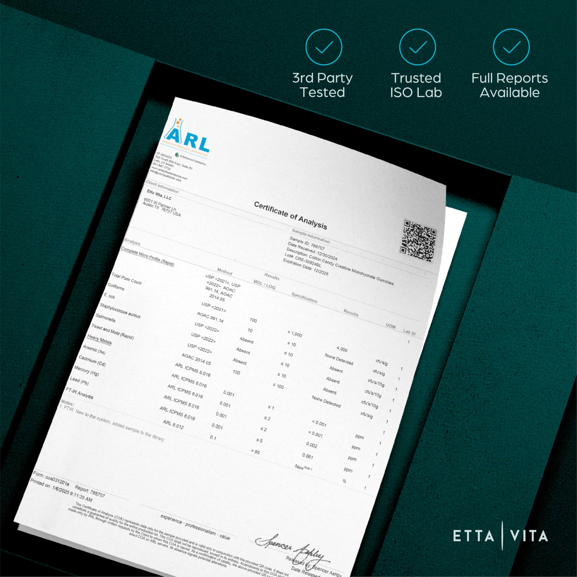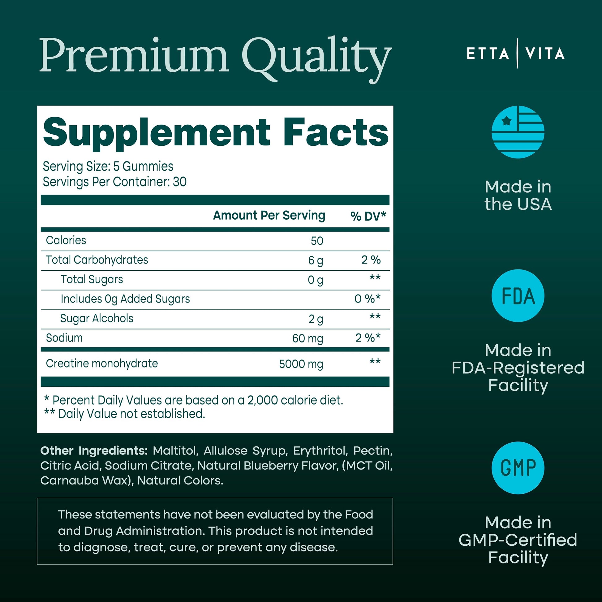 [High-Quality Lab-Tested Ingredients] - Our mono-hydrate creatine gummies for women and men are manufactured, tested, and bottled in our GMP-certified facilities. Etta Vita is committed to the highest quality ingredients and manufacturing processes.